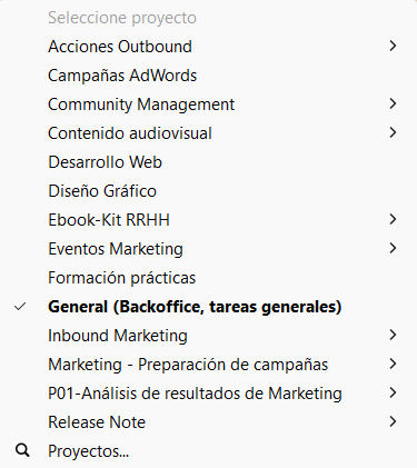 If the projects module is enabled, all configured projects available to users appear, with the project currently being worked on shown in bold.