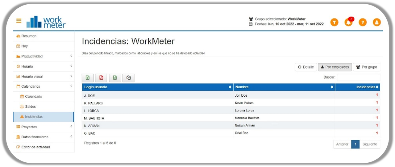 Quickly and easily check the effective working time, thanks to the incident panels and their detail by employee.