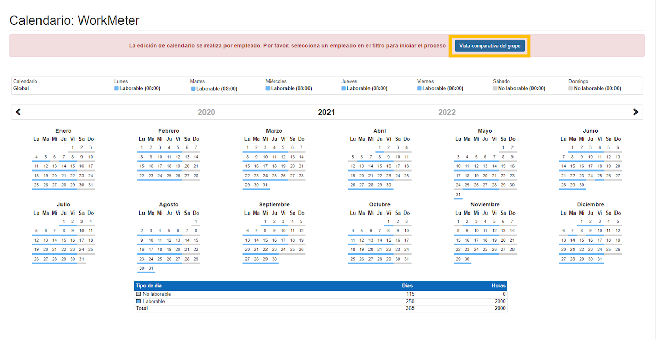 Dentro del apartado de "Calendario" es posible visualizar el calendario de los empleados clicando en el recuadro de"Vista comparativa del grupo".