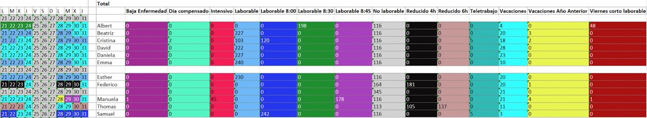 Podrás exportarloen un documento Excel, con tan solo un clic. Así tener una visión más completa y precisa del total de los días que le corresponden a cada empleado: Bajas, vacaciones, intensivos, reducidos, etc.