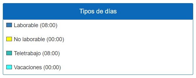 Una vez en el Calendario Grupal, se podrá visualizar los tipos de días de cada empleado, según se indica en el recuadro de leyenda en la parte inferior de la pantalla, seleccionando también el año que más te interese ver.