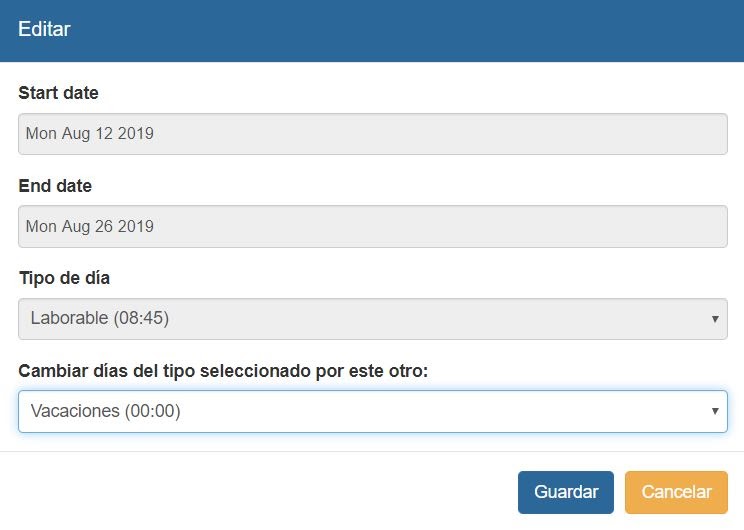 - Si la opción de configuración general permite la edición de calendario sin aprobación: El empleado podrá cambiar sus tipos de días del calendario para poder marcar fiestas, vacaciones, teletrabajo etc.