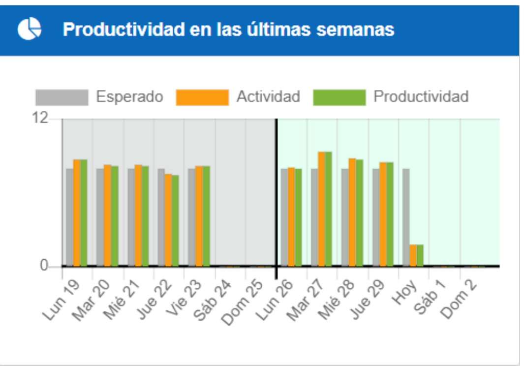 Cuando el trabajo efectivo está basado en la productividad, la gráfica muestra una comparativa de las últimas dos semanas del esperado, actividad y productividad.