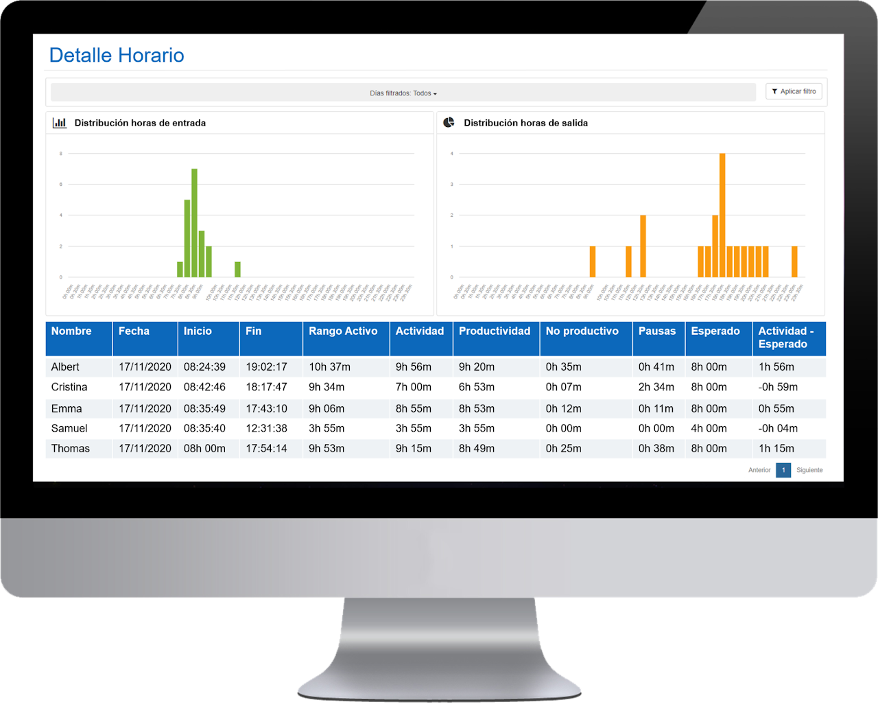 - Actividad – Esperado : actividad media diaria – esperado medio diario. Si el dato es superior a 0 indica las horas extras realizadas por el empleado. Si el dato es inferior a 0 indica el tiempo que el empleado le debe a la empresa.