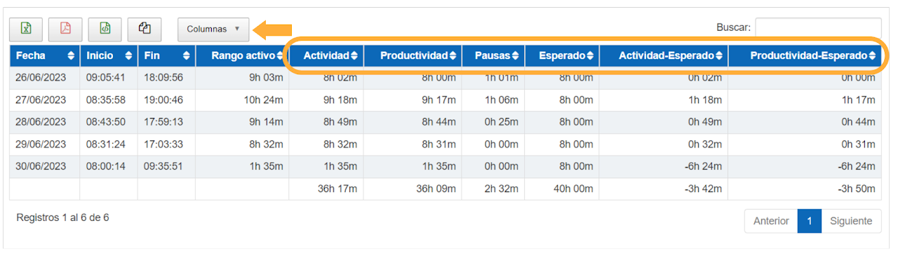 En la tabla del panel “Resumen por empleado”, ahora encontrarás valores absolutos del periodo de tiempo de actividad, productividad, esperado y diferencia.