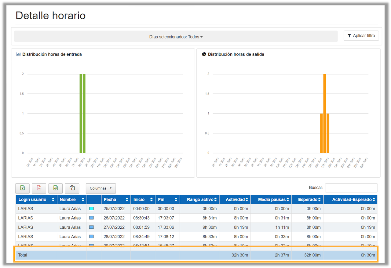 Dentro del panel “Detalle” del apartado “Horario”, al filtrar por un empleado, ahora es posible visualizar los totales de tiempo de actividad, pausas y esperado.