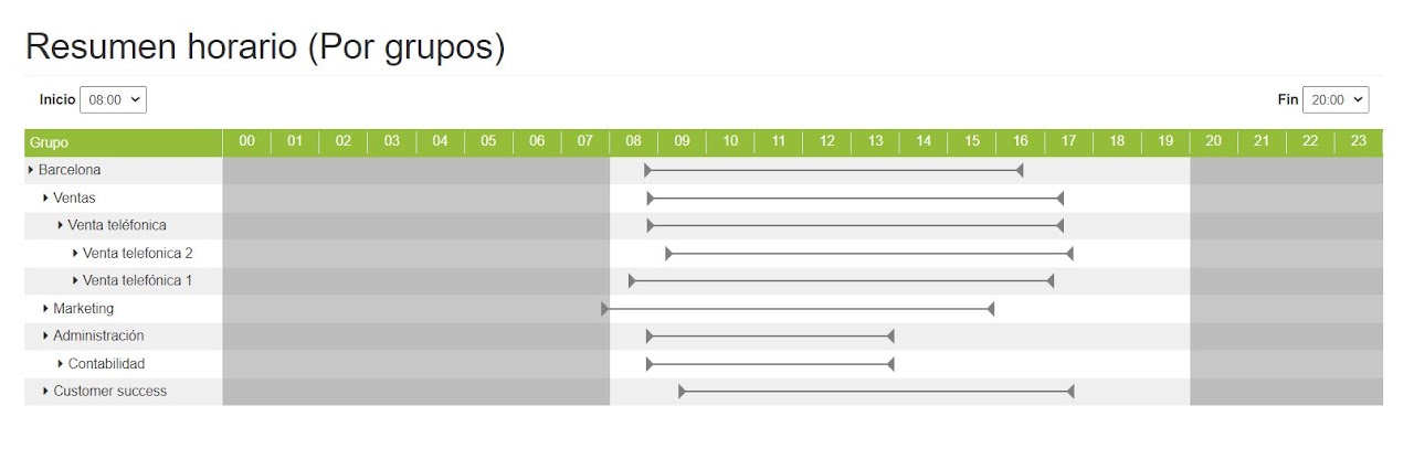 Las tablas contienen desplegables y replegables, para facilitar la lectura y comprensión de los datos expuestos. Los datos se pueden desplegar por grupo y subgrupo, de acuerdo a la información que quieras visualizar, también puedes seleccionar ver el rango activo de los grupos o departamentos de trabajo de tu empresa.