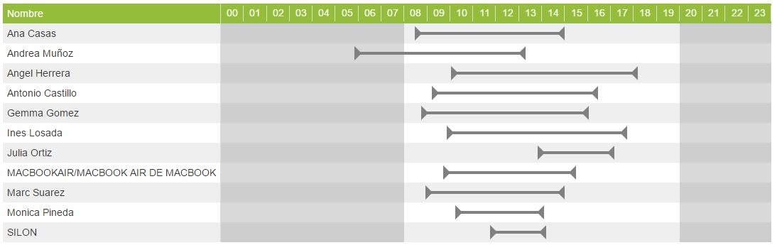 La gráfica nos muestra día a día las horas de inicio y fin de la actividad. La actividad real se muestra en color naranja, las pausas realizadas en color gris y la inactividad de los fines de semana en color celeste. La suma de ambos colores nos da el rango activo total. Solamente aparecen dibujadas las pausas que superan el tiempo mínimo considerado como pausa por el administrador (por defecto, 5 minutos)