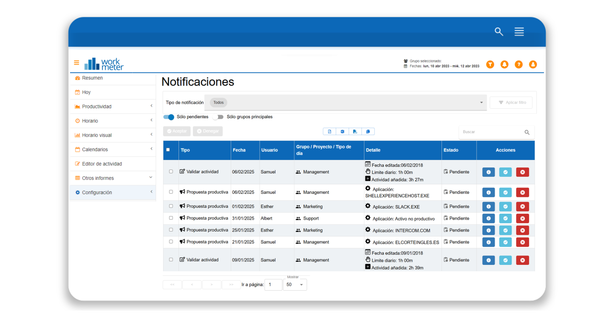 Dentro de este panel también existe la opción de ver " Sólo pendientes " para visualizar todo el histórico de solicitudes tanto aceptadas como rechazadas. También tienes la opción de ver "Sólo por grupos principales" que permite ver las notificaciones de los grupos de más alto nivel (para el Administrador será el grupo Todos y para los responsables de grupo serán los grupos más altos). Esta opción puede quedarse activada o desactivada según tu preferencia.