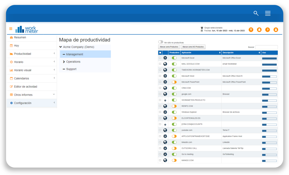 El mapa de productividad se configura para cada grupo de trabajo, pues habrán aplicaciones que podrán ser consideradas como productivas para un grupo y para otro no (por ejemplo, generalmente en el grupo de Marketing Online, Facebook o Twitter son productivas mientras que en Contabilidad o Ventas son improductivas).