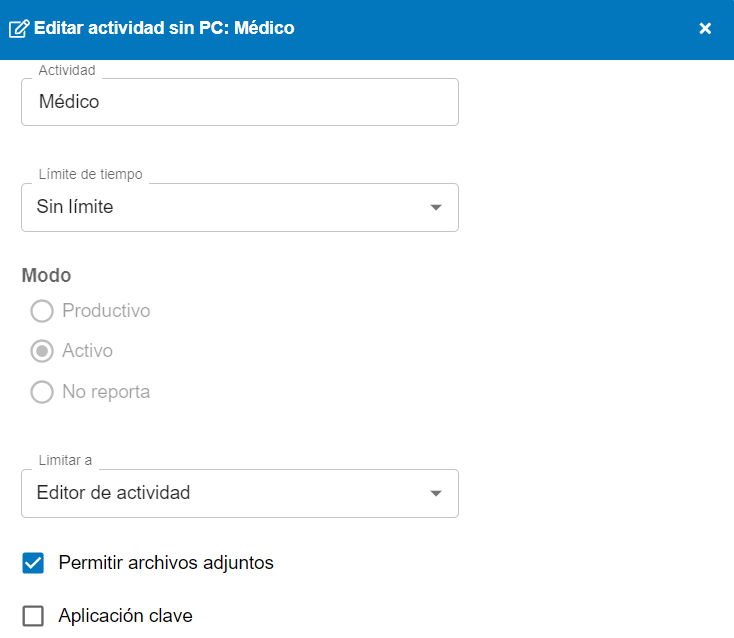 - Solo disponible para empleados: Solo los empleados podrán adjuntar archivos en la edición de actividades que lo permitan. Esta opción no está disponible para otros roles.