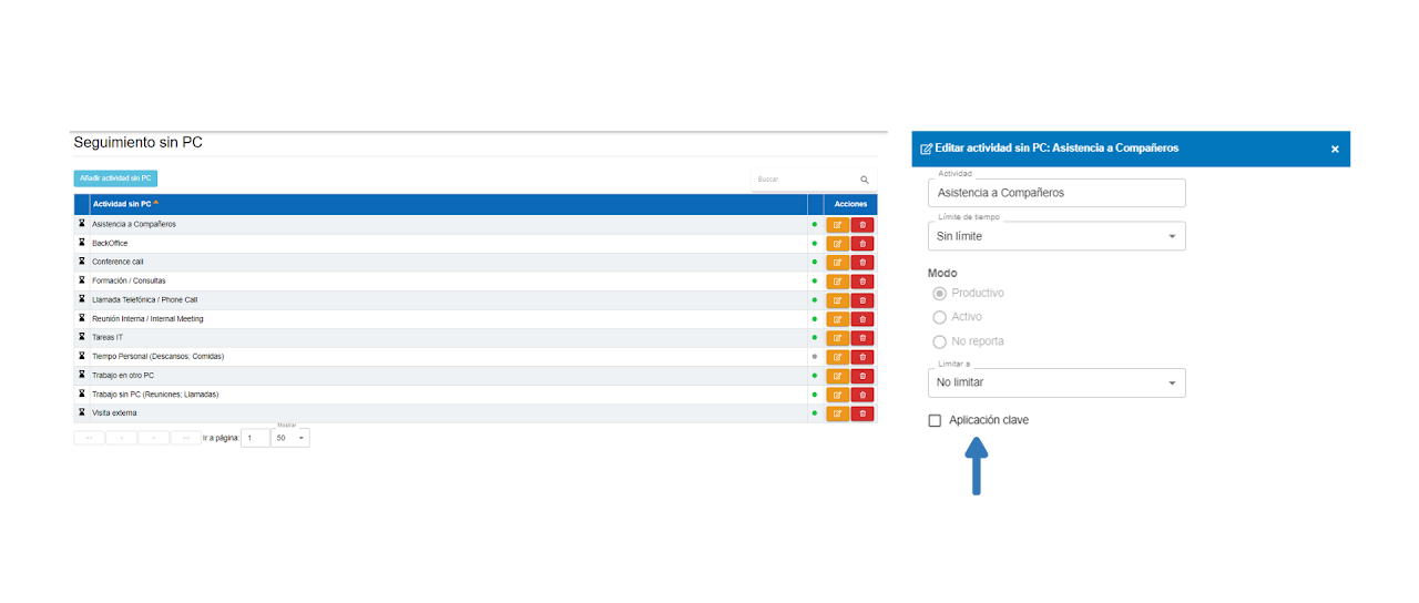 En la solución EffiWork , este panel se encuentra dentro de "Productividad" y la ruta es Configuración > Productividad > Seguimiento sin PC.