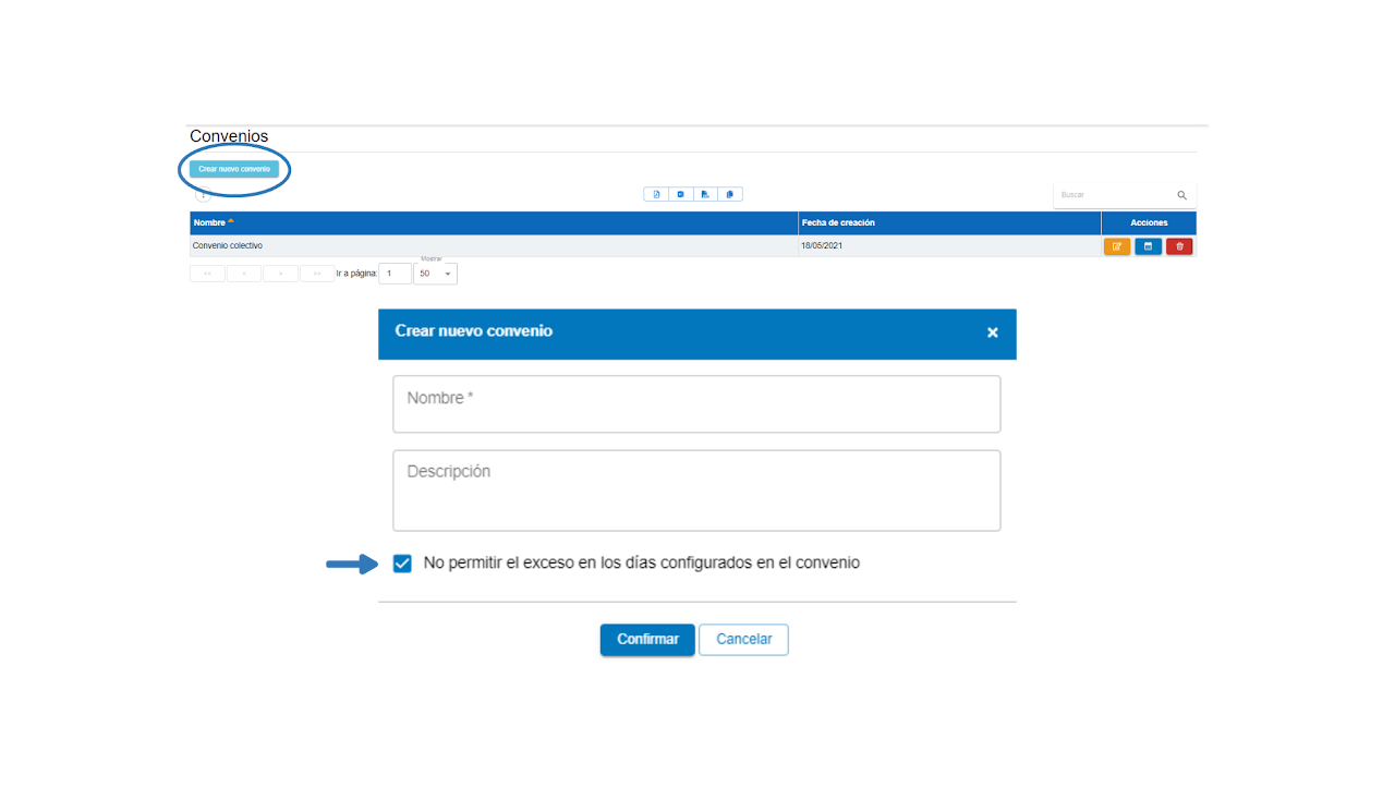 Una vez configurados los tipos de días, dirigirte aConfiguración > Calendarios > Conveniospara crear un nuevo convenio.
