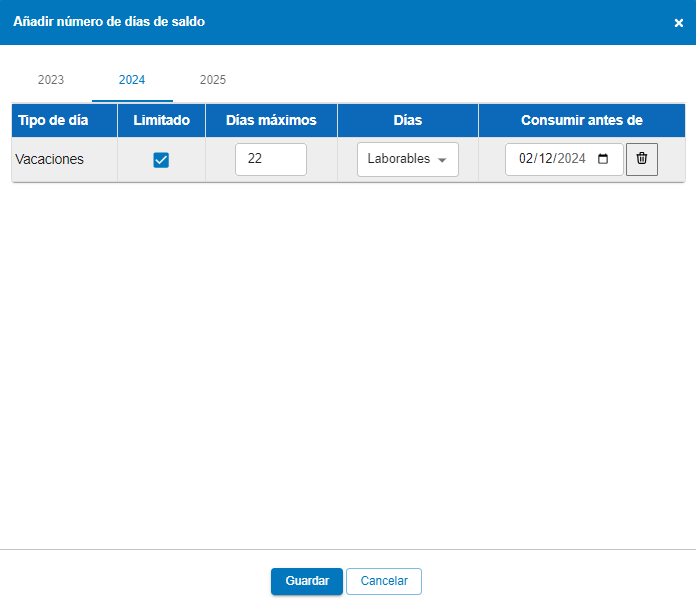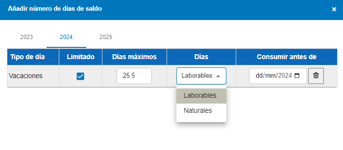 Hay empleados que en muchas ocasiones aún cuentan con días de vacaciones del año anterior. Puedesestablecer fechas límites para las que aplicar esos tipos de días en "Consumir antes de" .