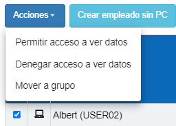 Al seleccionar la casilla de un empleado del listado, en la parte superior de la tabla, se activará el submenú "Acciones", el cual te permitirá: