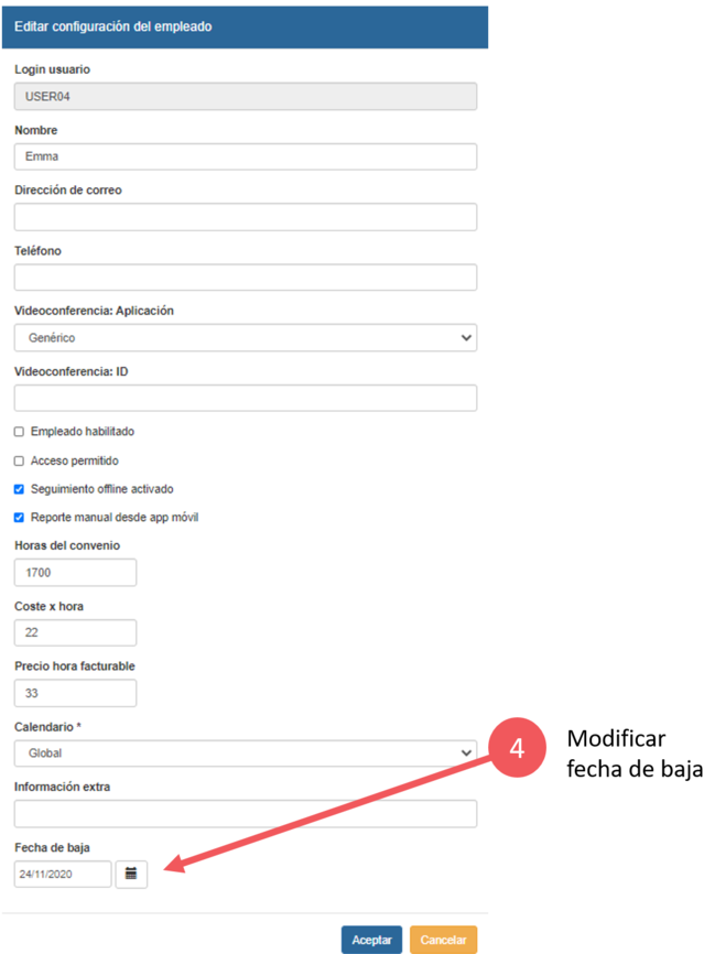 Dentro de la configuración de los empleados, puedes des-habilitar empleados que ya no tienen que reportar. Por defecto la fecha de la baja es la del día actual pero se puede modificar siguiendo los siguientes pasos: