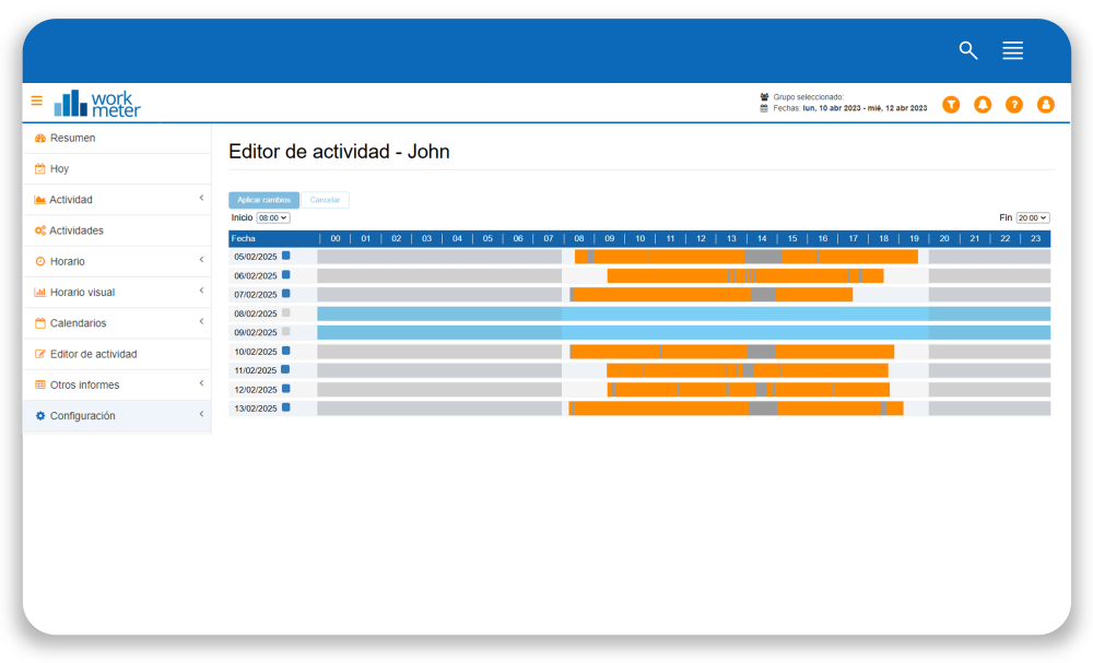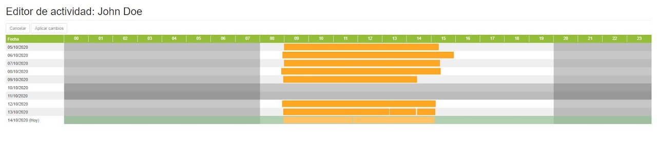 Una vez seleccionado un rango de fechas y un empleado concreto (si eres empleado solo con el rango de fechas es suficiente) haz clic en el panel “Editor de actividad” del menú izquierdo para acceder al resumen del horario visual.