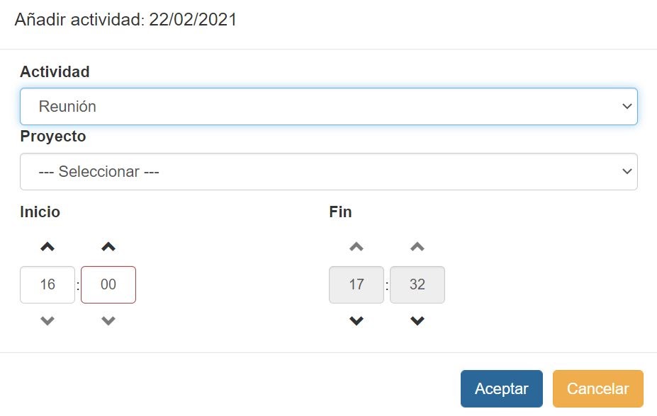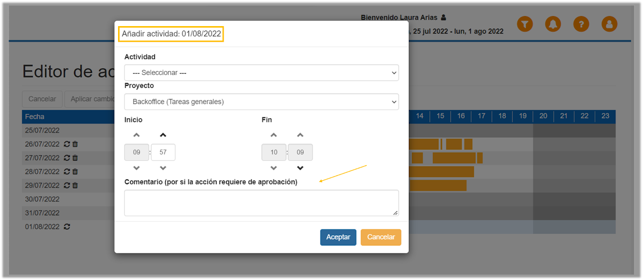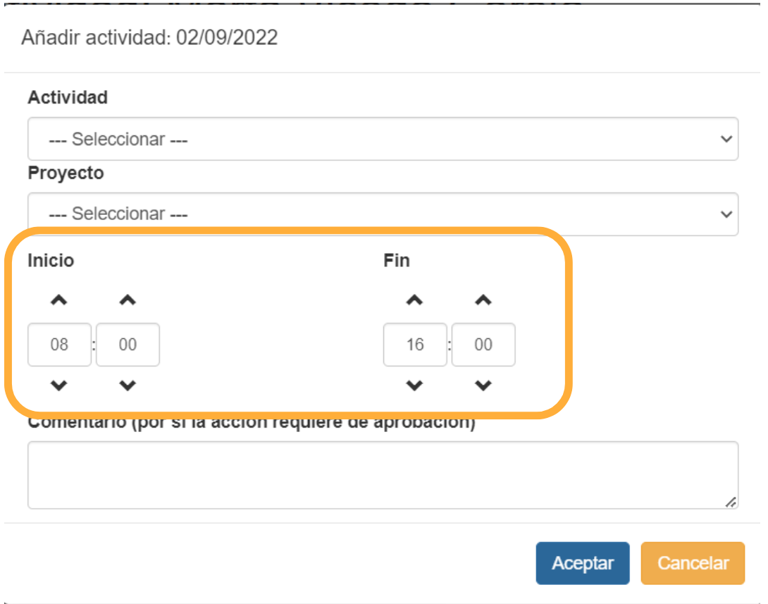Selecciona el tipo de actividad que quieres añadir así como las horas de inicio y de fin de dicha actividad. Por último dale al botón ”Aceptar”. Podrás editar el día en curso y añadir comentarios, si la acción lo requiere para su aprobación. Estos comentarios serán visibles en el panel de notificaciones del responsable de grupo o gerente, dependiendo de la configuración de la cuenta.