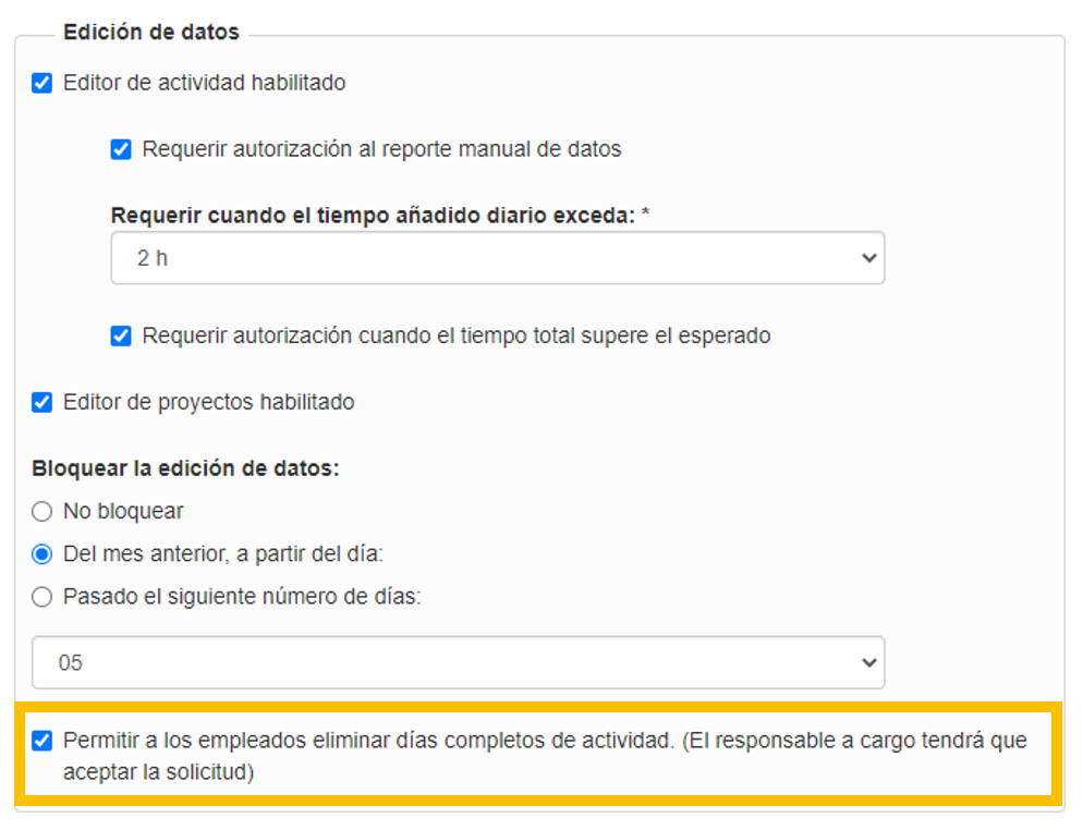 En el panel Configuración > Opciones generales hay una opción llamada "Requerir autorización al reporte manual de datos". Esto permite configurar un tiempo máximo de edición a partir del cual, el manager del empleado que añade ese tiempo, tendrá que aprobar o denegar la adición. Si el empleado hace varias adiciones de actividad el mismo día, el tiempo se irá sumando y, cuando exceda el límite, se requerirá aprobación por parte del manager. Por defecto, esta opción está deshabilitada."