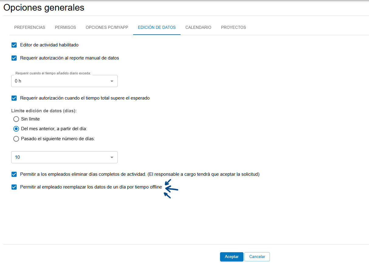 En la opción de"Permitir al empleado reemplazar los datos de un día por tiempo offline", se puede configurar el permiso para que los empleados puedan remplazar la actividad de todo un día desde el editor de actividad.