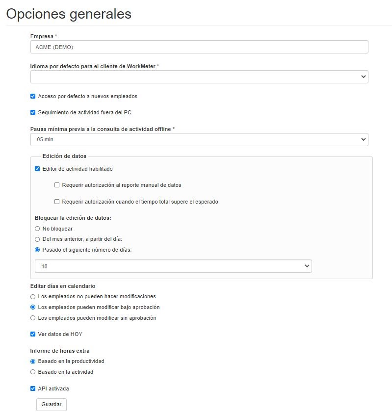 El administrador puede habilitar o deshabilitar el editor de actividad en el panel Configuración > Opciones generales y marcar/desmarcar la casilla “ Editor de actividad habilitado ” que se encuentra dentro del apartado de "Edición de datos" . El administrador también podrá decidir el periodo de bloqueo para la edición de datos, es decir, el tiempo que tiene el empleado para editar su actividad. Puede elegir no hacerlo habilitando la casilla "No bloquear" , decidir hacerlo con plazo de un mes habilitando la casilla "Del mes anterior, a partir del día" o seleccionando unos días concretos habilitando la casilla "Pasado el siguiente número de días" . Para las últimas dos opciones mencionadas, al final de las casillas el administrador debe desplegar y seleccionar el numero de días, según corresponda.