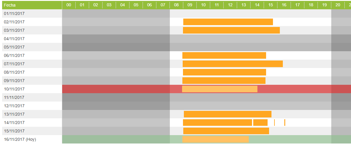 El día actual se puede modificar siempre y cuando no haya actividad previa detectada y sólo hasta la hora entera anterior. Es decir, si a las 13:13 se comenzó a registrar la actividad, se podrá editar solo hasta las 13:00. Pero si hubo actividad previa detectada en el día en curso, no se podrá modificar la jornada. Cuando se han realizado cambios y se están procesando los nuevos datos, se bloquea también el día en curso.