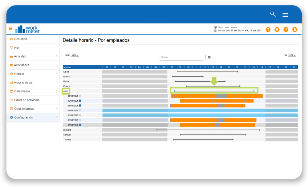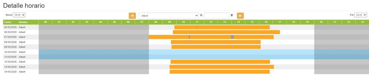 Si haces clic en la línea de color gris se despliega el detalle por día para dicho empleado. La actividad se representa en color naranja y las pausas detectadas en color gris Si volvemos a clicar el detalle diario se repliega de nuevo.