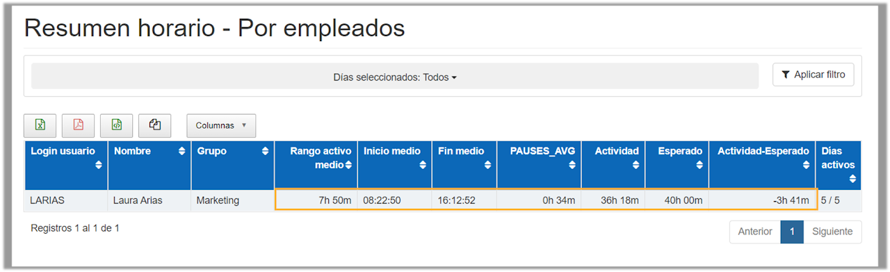 - Actividad – Esperado : actividad media diaria – esperado medio diario. Si el dato es superior a 0 indica las horas extras realizadas por el empleado. Si el dato es inferior a 0 indica el tiempo que el empleado le debe a la empresa.