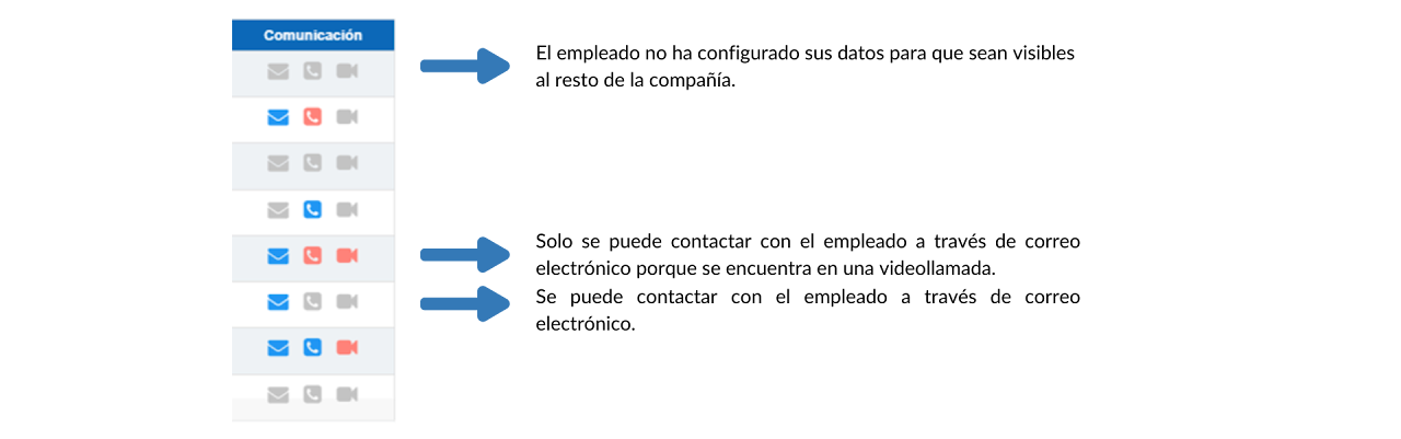 La columna denominada “Comunicación” muestra los canales disponibles para establecer una comunicación con el trabajador correspondiente. Pulsando sobre los iconos disponibles se abre la aplicación configurada para cada medio.