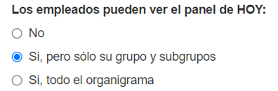 Tal configuración permite o limita la visualización del panel “Hoy” a los empleados. En caso de permitir su visualización, se debe configurar si los empleados podrán ver la información de todo el organigrama o solo de su grupo y subgrupos.
