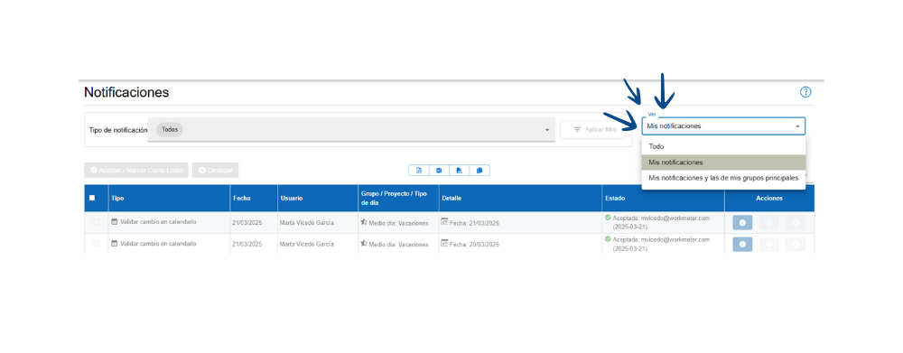 - Ver - Todo: Muestra todas las notificaciones, tanto las asignadas a ti como las de todos los grupos que gestionas.