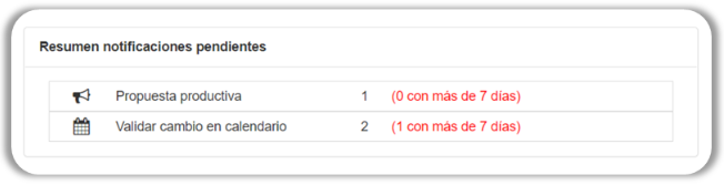 - Validar cambio en el calendario: Al clicar accederás rápidamente a tu panel de notificaciones y verás sólo las solicitudes referentes a cambios en el calendario, ya que la tabla de contenido estará previamente filtrada.