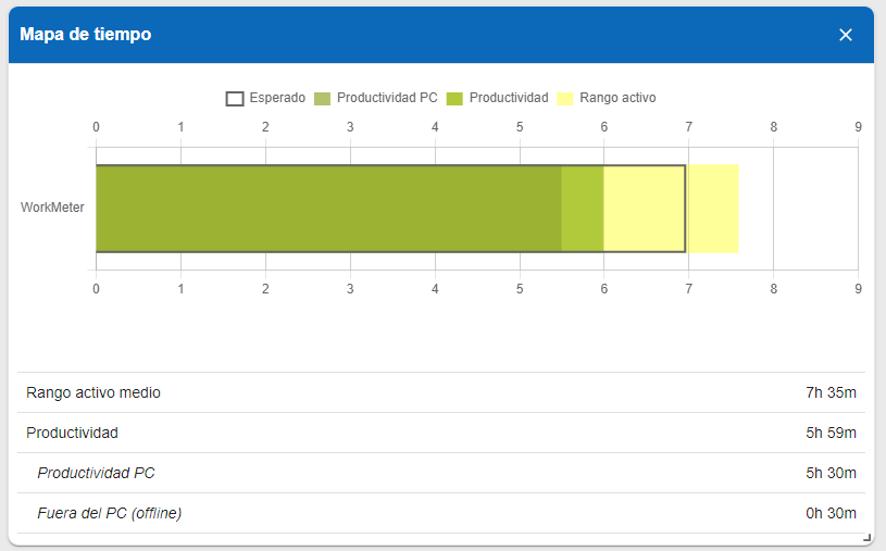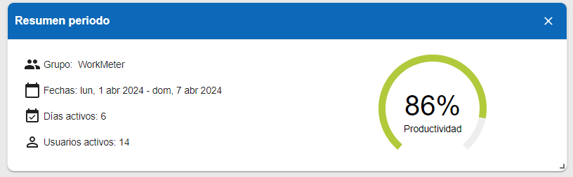 Te muestra un resumen de las medias de los principales indicadores de tiempo recogidos por el software para el grupo de trabajo y el periodo de fechas seleccionado.