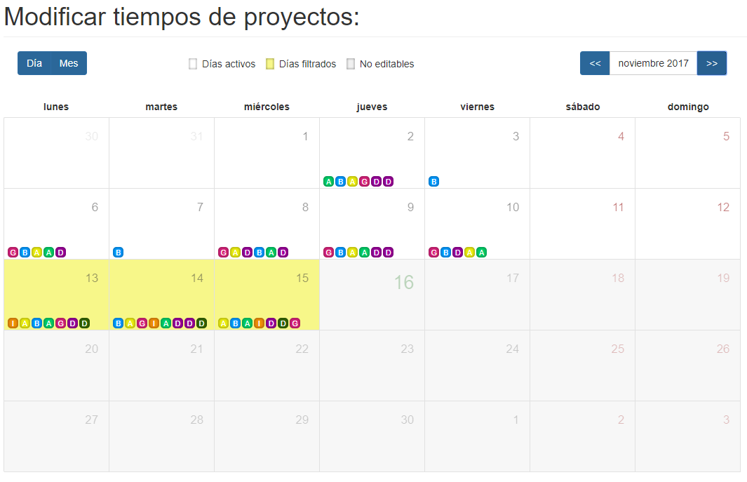 Gracias a este panel de WorkProject ya es posible redistribuir tiempos de un proyecto a otro y realizar cambios necesarios que reflejen un escenario lo más fiel posible a la realidad. Para empezar, tienes dos tipos de visualización diferentes: por mes y por día :