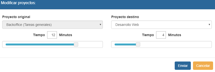 En este panel podrás modificar el tiempo de tus proyectos y asignarlos a otros diferentes
