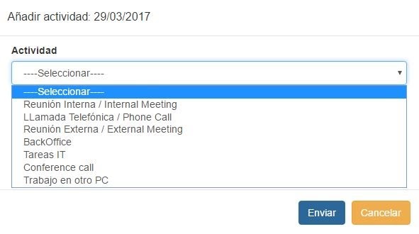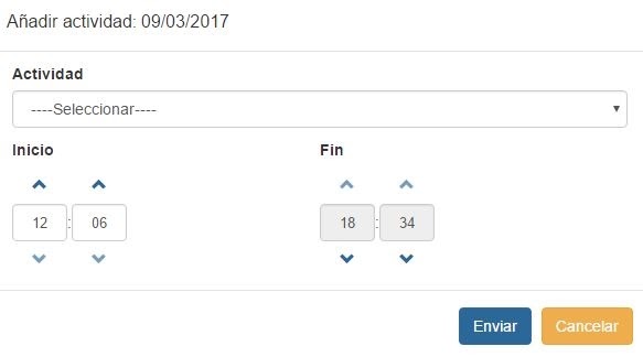 Selecciona el tipo de actividad que quieres añadir así como las horas de inicio y de fin de dicha actividad. Por último dale al botón ”Enviar”.