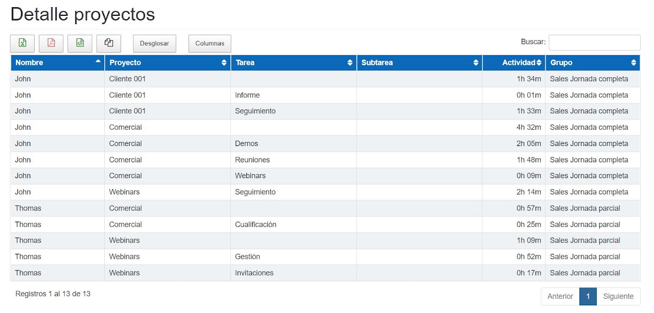 Muestra la información de todos los proyectos creados por tareas, subtareas y grupos. A su vez, muestra la actividad dedicada a cada proyecto.