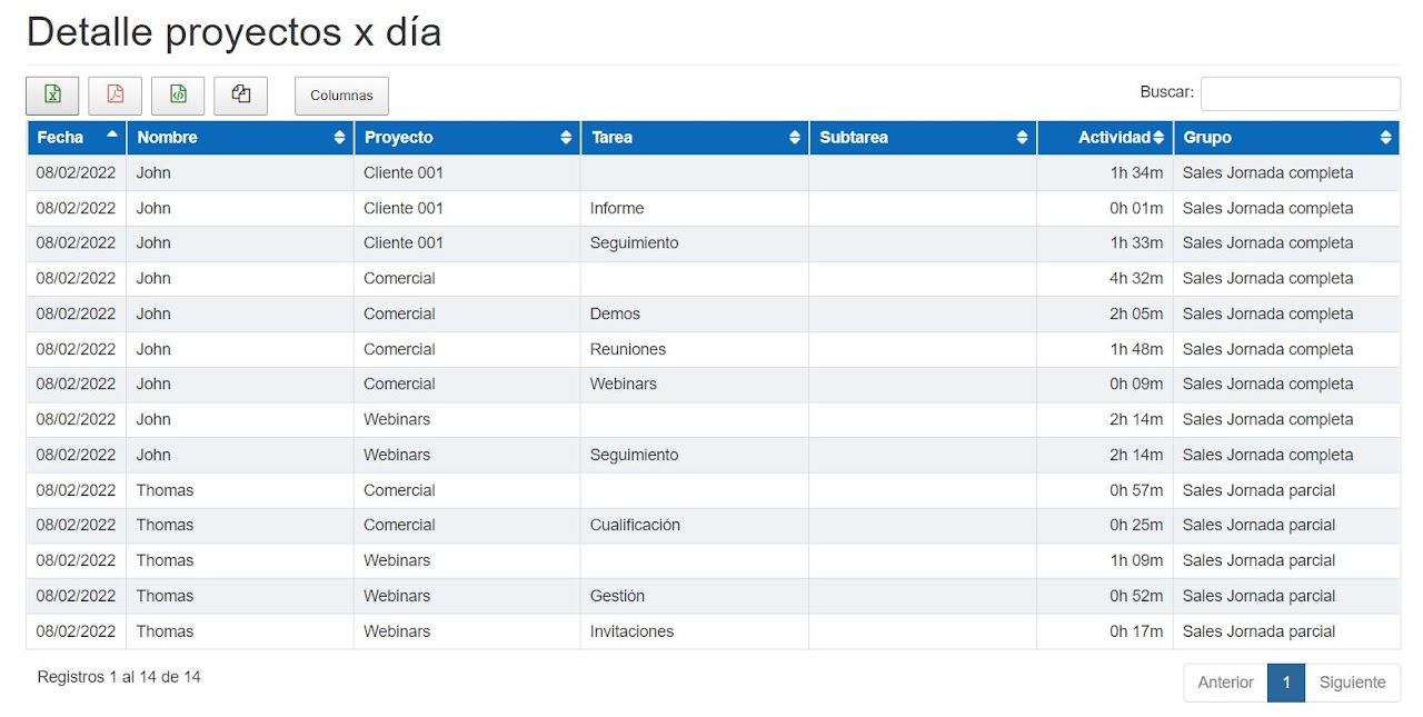 Muestra la misma información que el informe de proyectos pero separado por días y completamente desglosado.